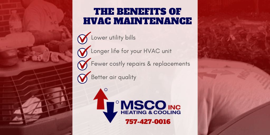 - Better air quality: The expert team at MSCO will clean your HVAC system and replace air filters when they come for your semi-annual service visit, so you’ll notice that your air is cleaner after they’ve performed maintenance!